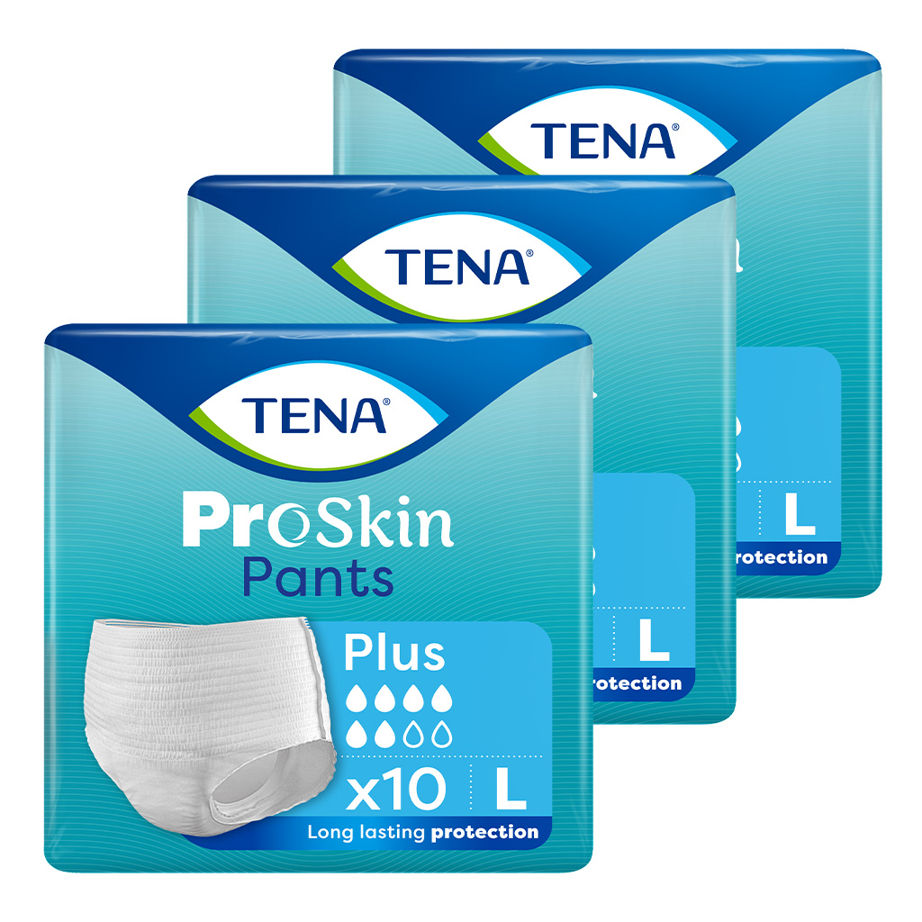 3X TENA Pants ProSkin Plus L (100–135 cm), majtki chłonne, 10 szt.