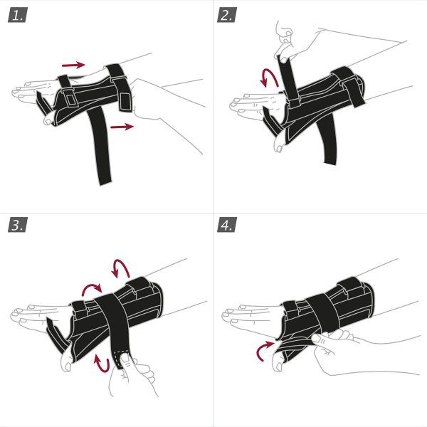 - Łatwe zakładanie i zdejmowanie ortezy przy pomocy jednej ręki, dzięki konstrukcji przypominającej rękaw oraz prostej regulacji otworu na kciuk.