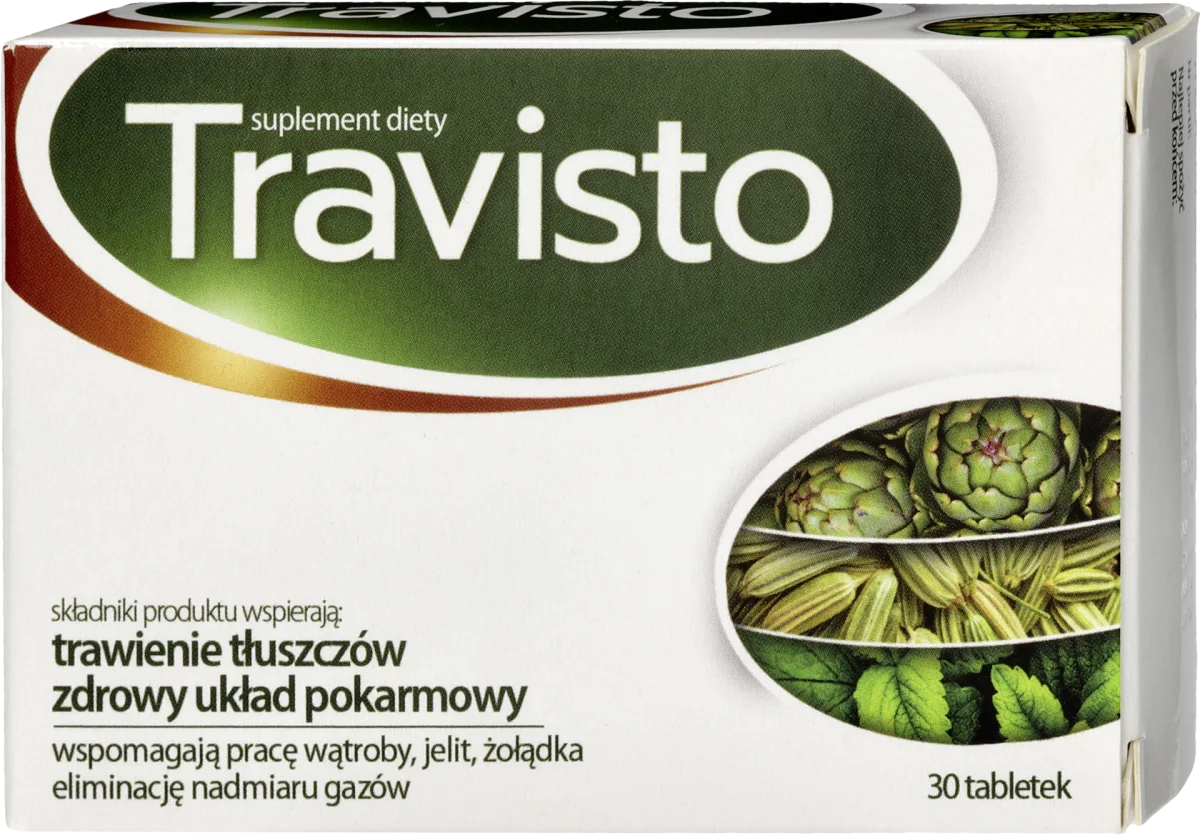 Travisto to suplement diety przeznaczony dla dorosłych w postaci tabletek, który został stworzony z myślą o wspieraniu zdrowego układu pokarmowego. Ten suplement opiera się na naturalnych składnikach roślinnych, takich jak mięta pieprzowa, karczoch, koper włoski oraz kurkuma.