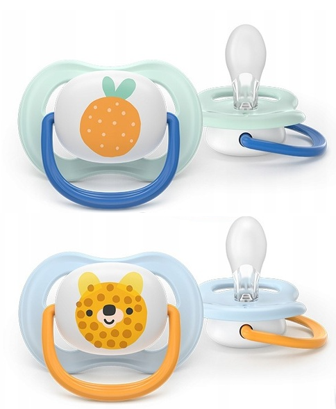 Philips Avent Ultra Air Happy 0–6 m – 2 szt Lekki i oddychający smoczek stworzony z myślą o wrażliwej skórze niemowląt. 4 duże otwory w tarczy zapewniają swobodny przepływ powietrza, dzięki czemu skóra dziecka pozostaje sucha i mniej podrażniona.