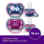 Smoczki AVENT ULTRA AIR 18m+ to idealne rozwiązanie dla starszych dzieci powyżej 18. miesiąca życia. Ich lekka konstrukcja, duże otwory wentylacyjne i urocze wzory, takie jak słoniki i napis Love, sprawiają, że są zarówno funkcjonalne, jak i estetyczne.