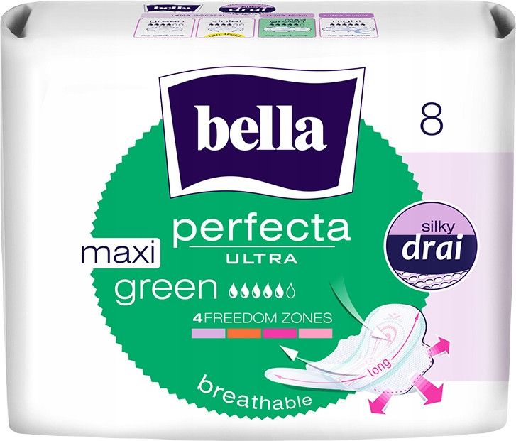 Podpaski Bella Perfecta Ultra Maxi Green to wyjątkowo delikatne produkty, szczególnie polecane przy obfitych miesiączkach. Dzięki zastosowanej siateczce Silky Drai, redukują ryzyko powstawania podrażnień, skutecznie chroniąc przed wilgocią i zapewniając zwiększone poczucie suchości.