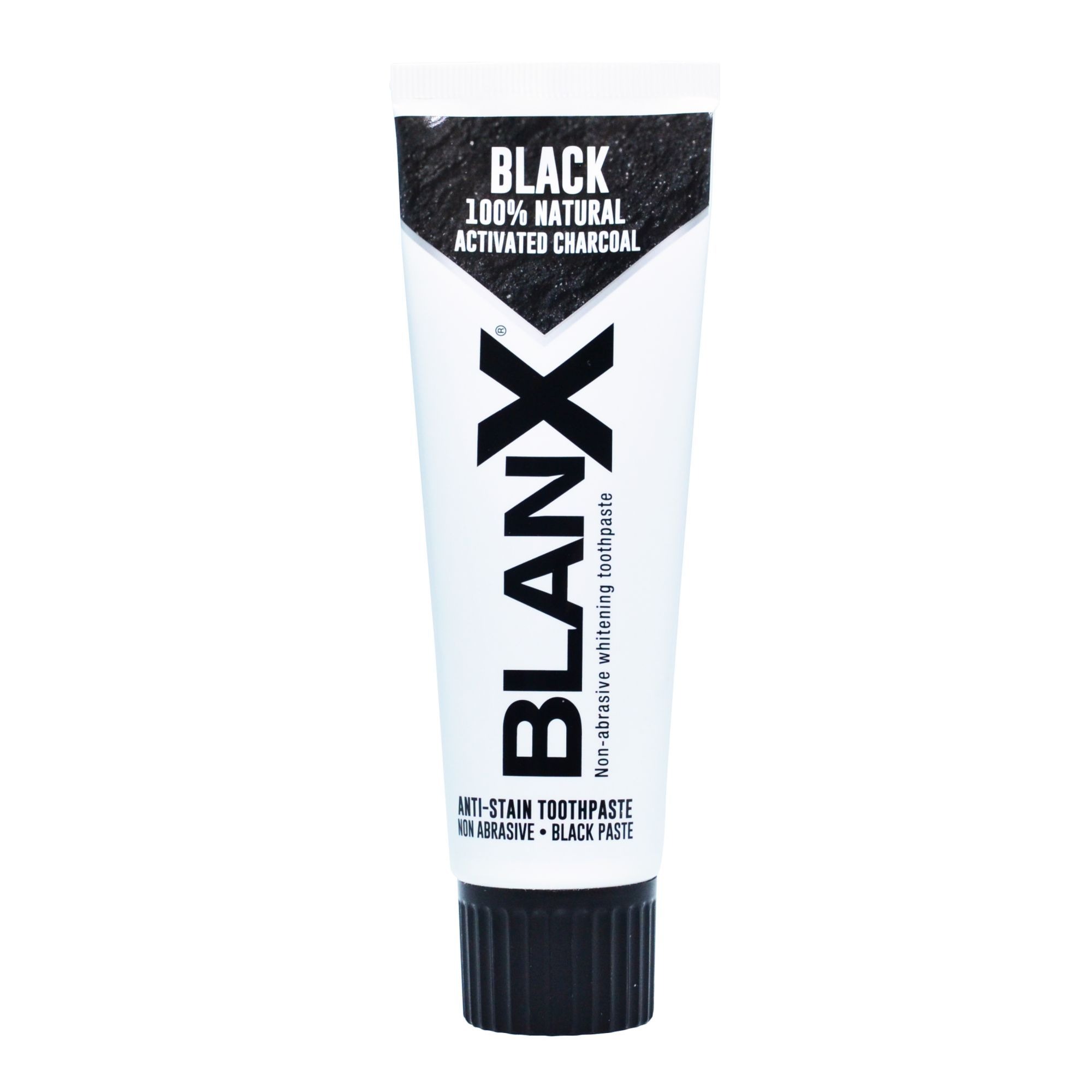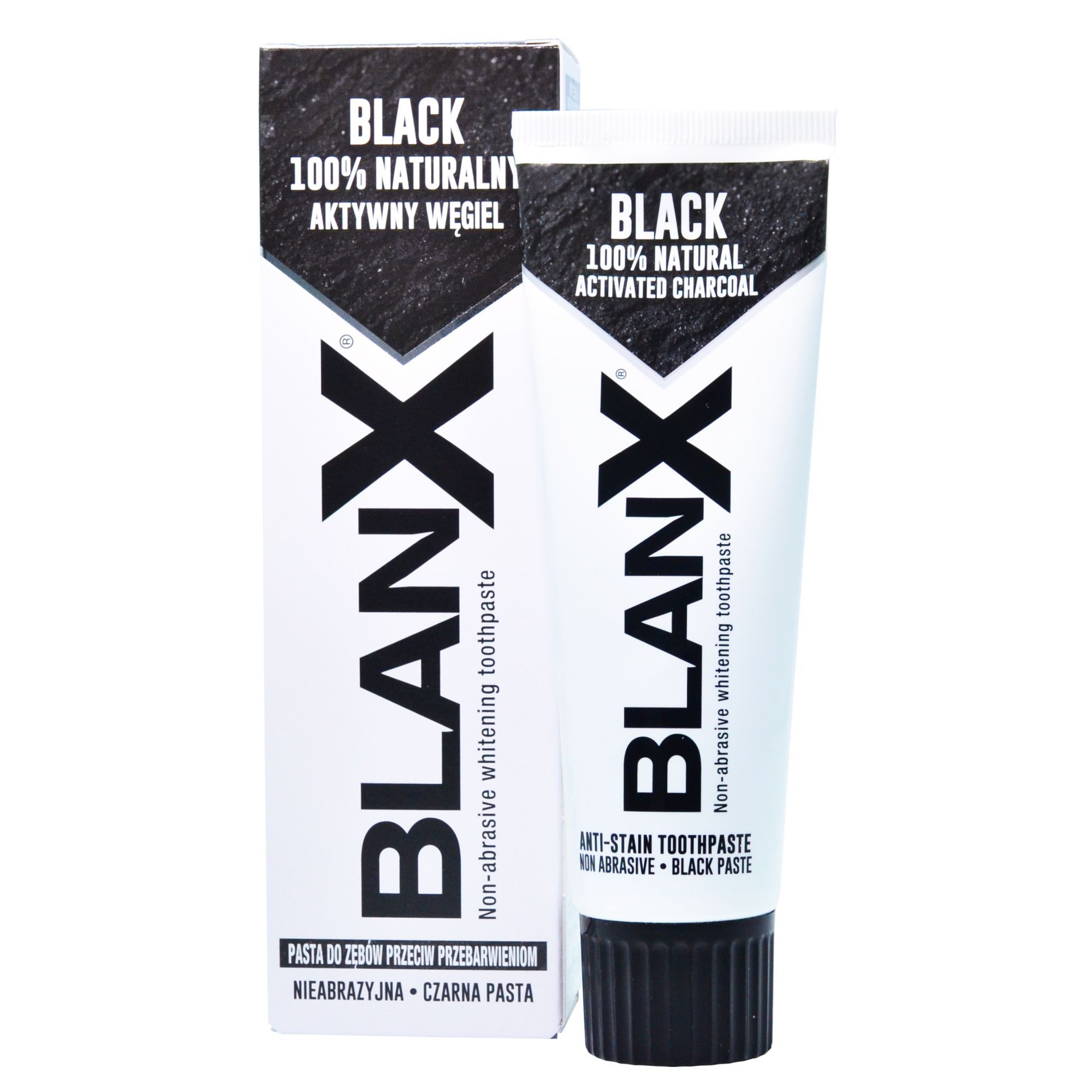 Wybielająca pasta BlanX Black przeciw osadom skutecznie eliminuje przebarwienia z zębów. Głównym składnikiem tej czarnej pasty jest aktywny węgiel z drzewa kokosowego, który dzięki swoim naturalnym właściwościom absorpcyjnym pochłania bakterie, toksyny oraz osady na powierzchni szkliwa, przywracając naturalną biel zębów.