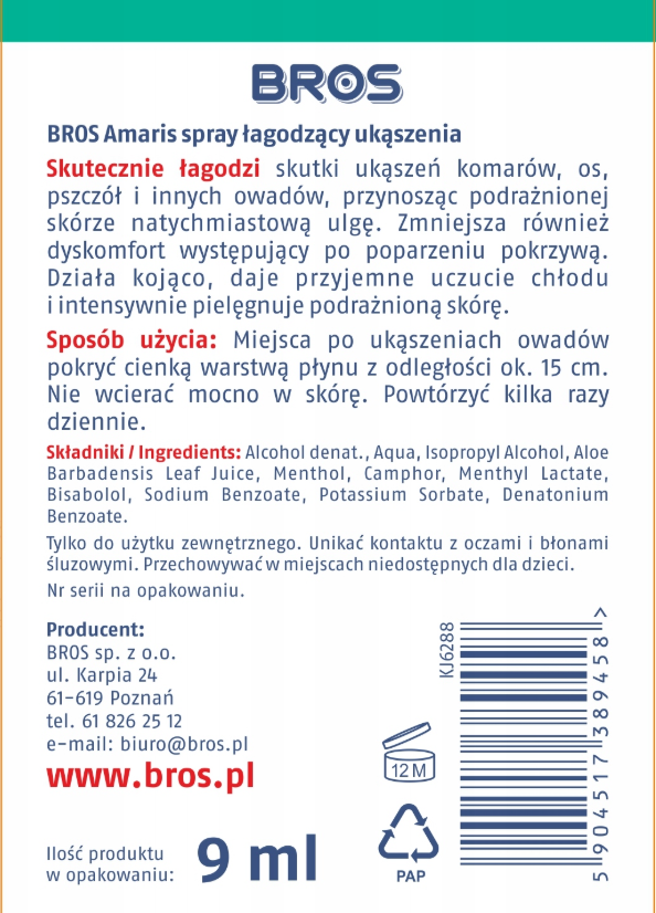 BROS - Amaris - spray łągodzący ukąszenia 9 mlBROS – Amaris – spray łągodzący ukąszenia 9 ml