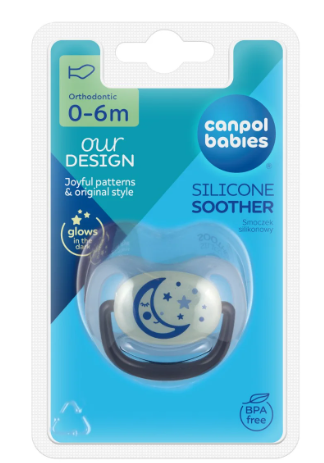 CANPOL Smoczek do uspokajania silikonowy anatomiczny Night Dreams 0-6m niebieski świecącyDostępność: Mało na stanie