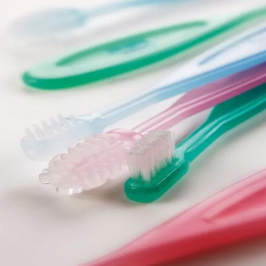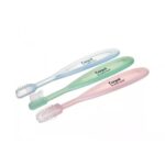 O wyglądzie tradycyjnej szczoteczki, przeznaczona do mycia pierwszych ząbków. Gumowa końcówka zabezpiecza przed bolesnym urażeniem dziąseł i ząbków dziecka.