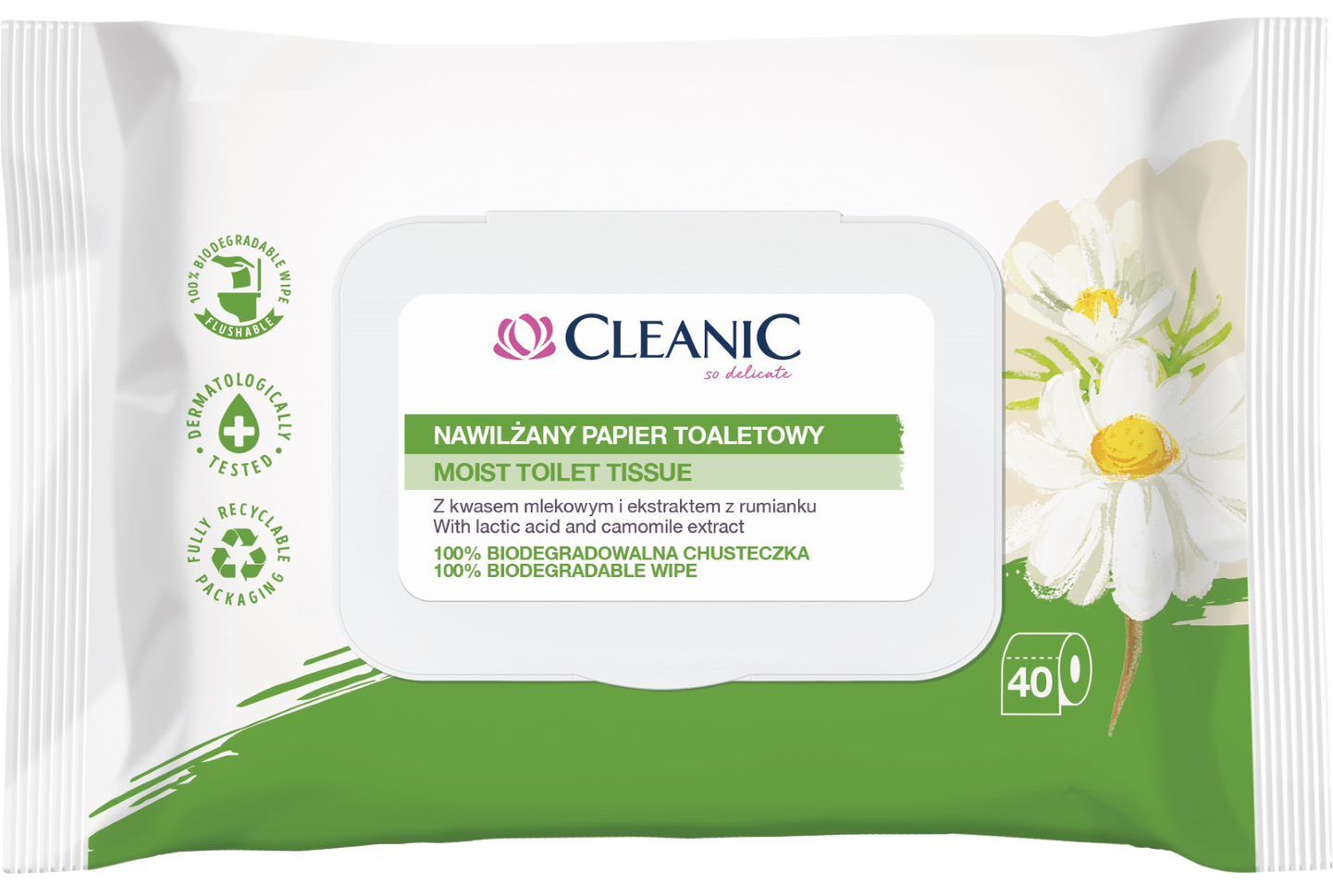 Nawilżany papier toaletowy Cleanic skutecznie oczyszcza i odświeża miejsca intymne, zapewniając uczucie komfortu przez cały dzień. Specjalnie opracowana formuła, wzbogacona ekstraktem z rumianku, łagodzi podrażnienia. To doskonałe uzupełnienie codziennej higieny.
