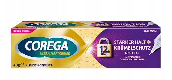 Corega Super Mocny + Osłona to krem mocujący do protez zębowych, który zapewnia silne i długotrwałe utrwalenie, a dodatkowo tworzy ochronną barierę, pomagając zmniejszyć przedostawanie się resztek pokarmu pod protezę. Dzięki neutralnemu, naturalnemu smakowi nie zmienia odczuć podczas jedzenia ani picia.