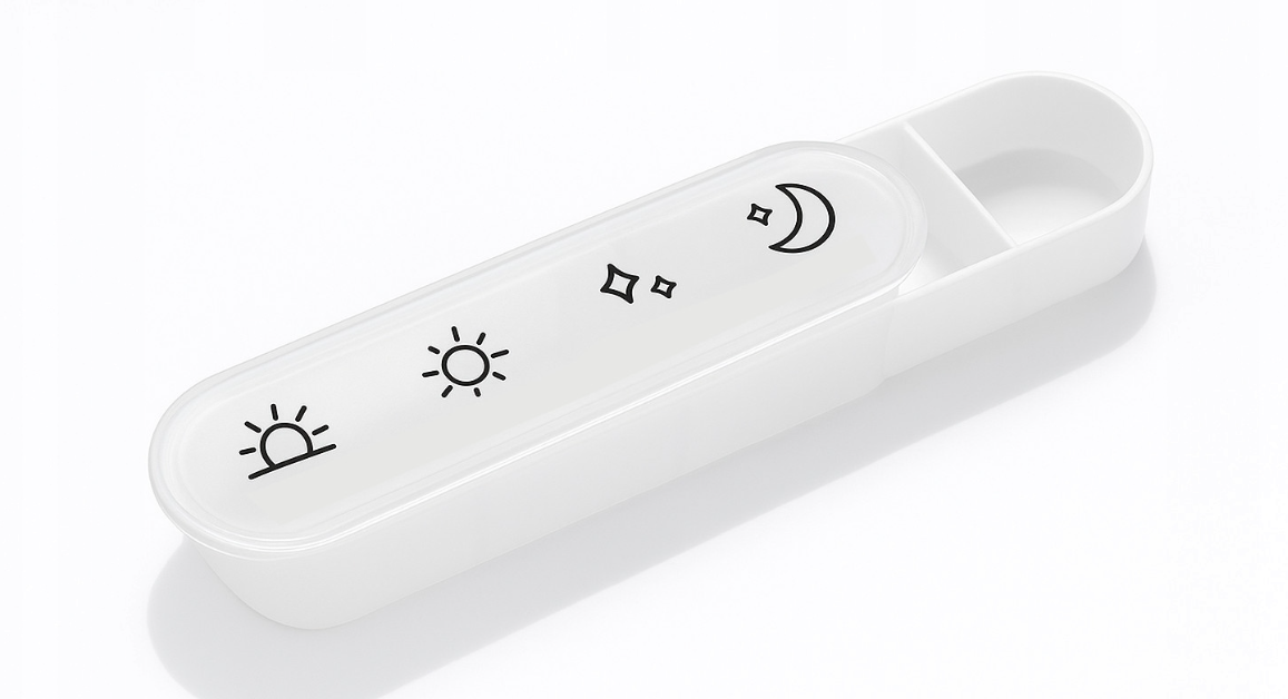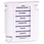 Funkcjonalny organizer na leki, który pomaga w precyzyjnym rozplanowaniu dawkowania na cały tydzień. Pojemnik posiada osobne kasetki na każdy dzień, a każda z nich jest podzielona na cztery komory oznaczające pory dnia: rano, popołudniu, wieczorem i nocą.