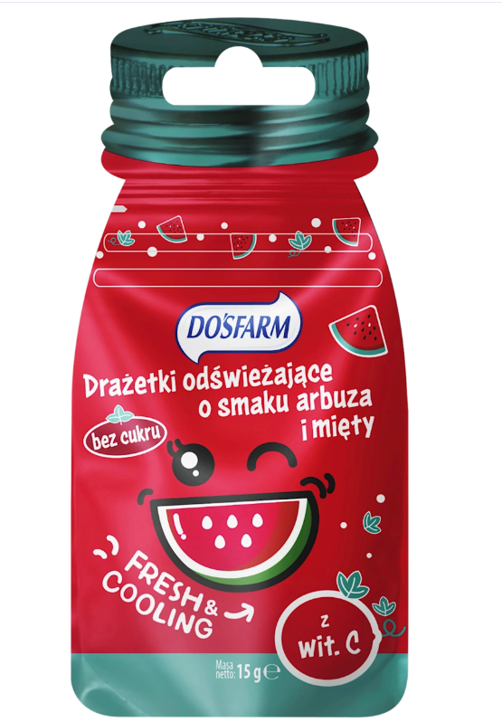 DOSFARM Drażetki odświeżające bez cukru o smaku miętowo arbuzowym. Saszetka z zapięciem strunowym 15g