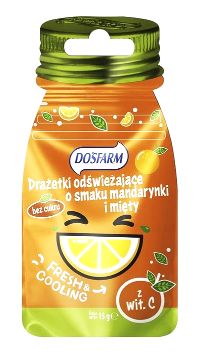 DOSFARM Drażetki odświeżające bez cukru o smaku mięta mandarynka. Saszetka z zapięciem strunowym 15g
