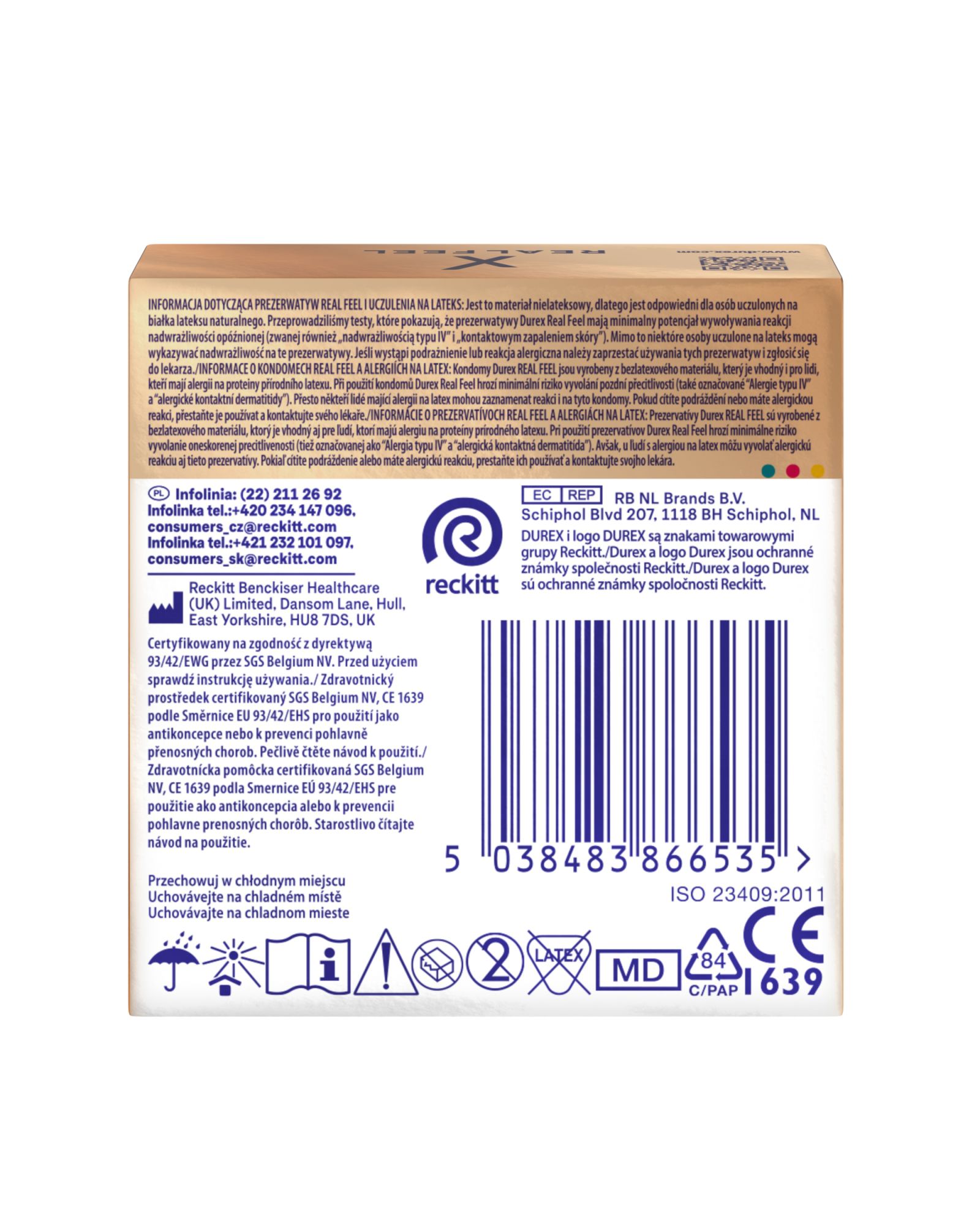 Durex Real Feel pomaga zwiększyć przyjemność obojga partnerów i osiągnąć jeszcze bardziej rozkoszny orgazm. Miękkość prezerwatywy pomaga w pogłębianiu wrażenia intymności, uwrażliwienia i bliskości. Dla osiągnięcia jeszcze lepszego poślizgu i poprawienia jakości seksu Durex Real Feel są pokryte silikonowym lubrykantem.
