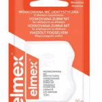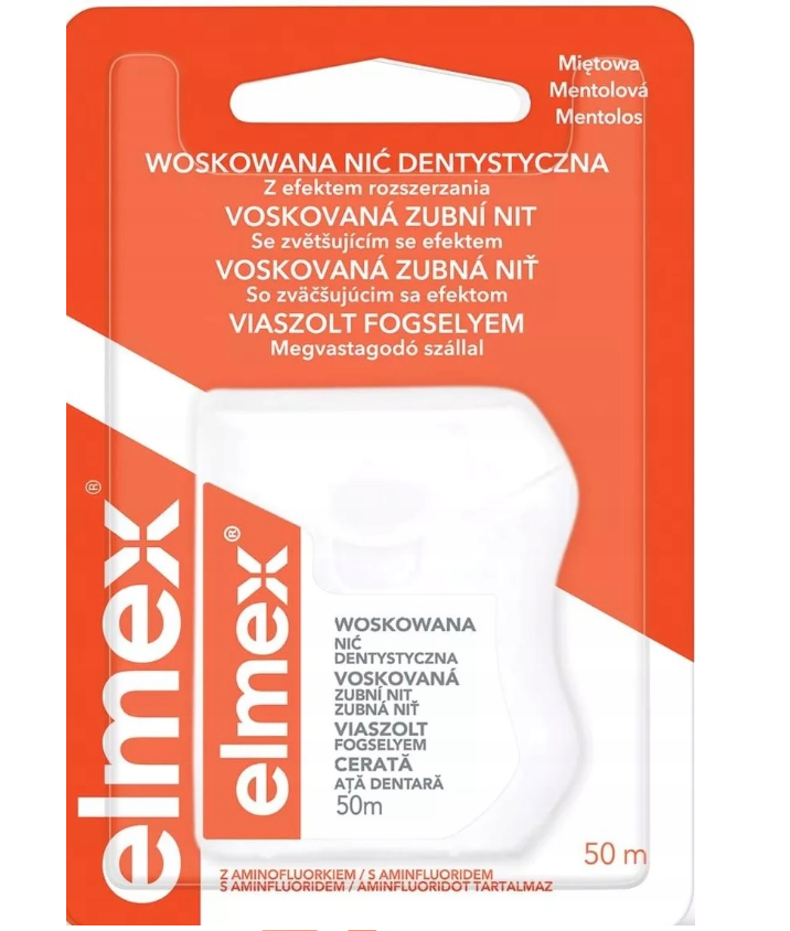 Woskowana nić do zębów elmex. Wykonana jest z monowłókna, które się nie strzępi. Nić jest woskowana, dzięki czemu łatwo wprowadza się w przestrzenie międzyzębowe. Posiada przyjemny miętowy smak. Długość 50 m.