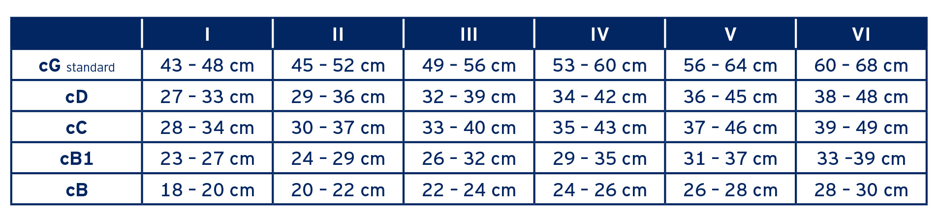 rozmiar I: cG standard 43 – 48 cm, cD 27 – 33 cm, cC 28 – 34 cm, cB1 23 – 27 cm, cB 18 – 20 cm