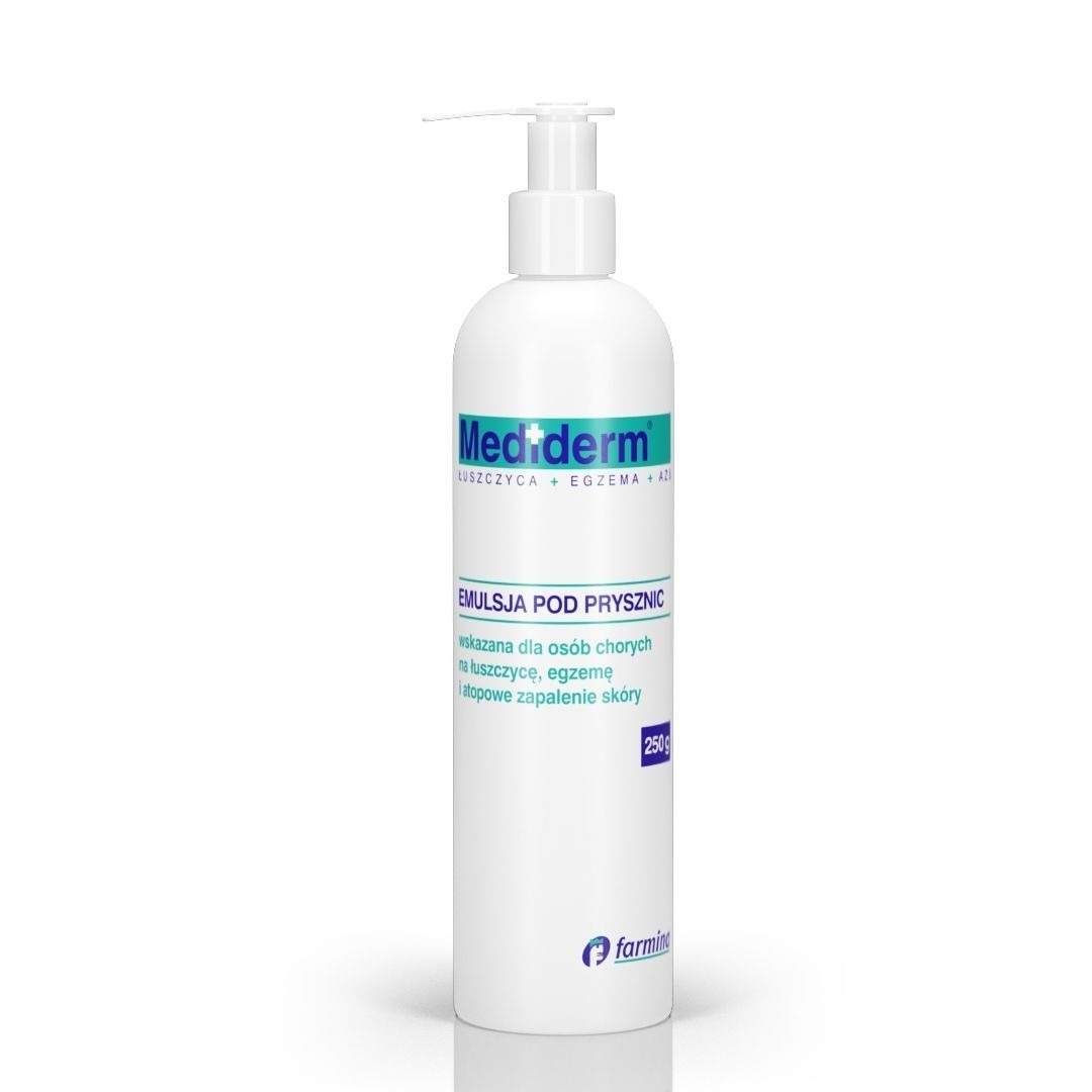 Mediderm® EMULSJA POD PRYSZNIC jest nawilżającą, niepieniącą się emulsją, opracowaną specjalnie do pielęgnacji chorobowo zmienionej skóry w przebiegu łuszczycy, egzemy i atopowego zapalenia skóry.