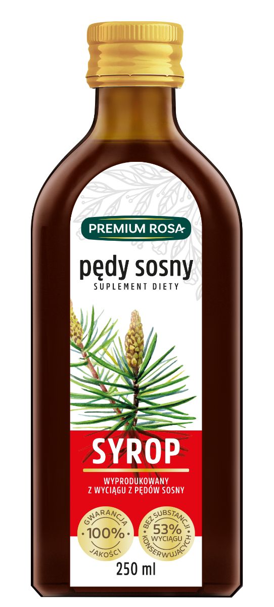 Naturalny syrop sosnowy wytwarzany jest z wyciągu ziołowego. Syrop ma piękną, naturalną barwę i przyjemny smak, który przenosi nas do lasu. Sprawdzi się jako dodatek do herbaty, wody mineralnej i deserów. Pędy sosny mogą korzystnie działać na drogi oddechowe.