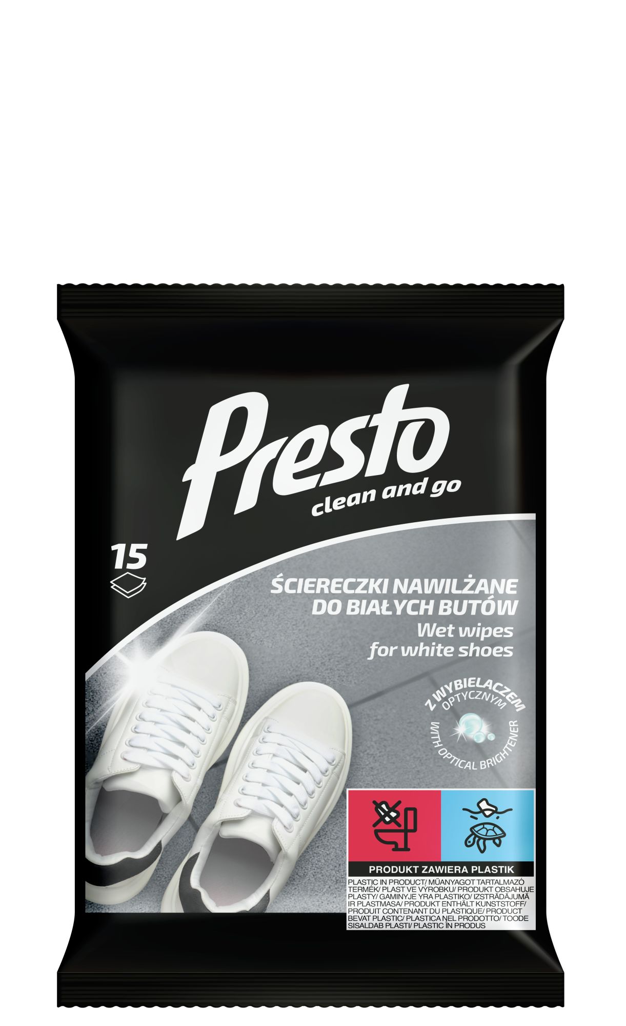 • Niezawodny produkt: Nawilżane ściereczki Presto skutecznie usuwają zabrudzenia z białego obuwia, wykonanego z różnych materiałów, w tym gumowej podeszwy.
