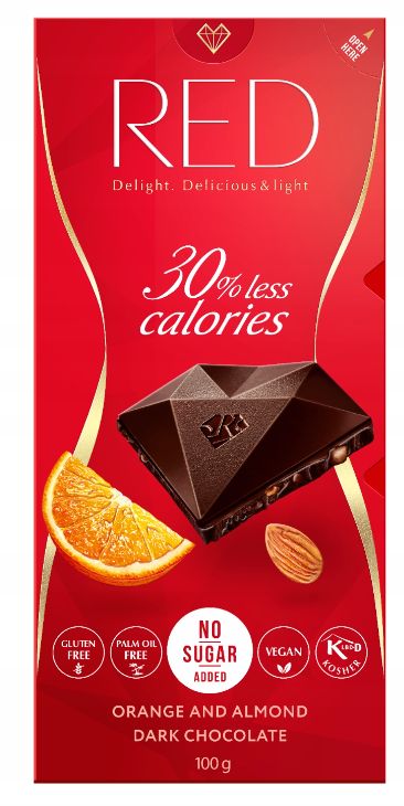 RED Czekolada ciemna z pomarańczą i migdałami o zmniejszonej zaw. kalorii (-50%) – 100g