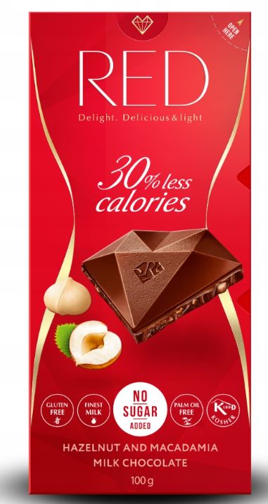 RED Czekolada mleczna z orzechami laskowymi i Makadamia o zmniejszonej zaw. kalorii, 100g