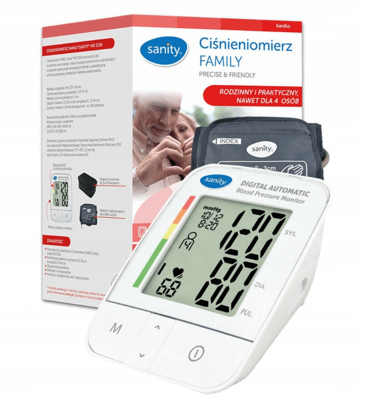 Ciśnieniomierz SANITY FAMILY MD 3150 to urządzenie zaprojektowane do codziennego pomiaru ciśnienia krwi. Idealne dla osób z nadciśnieniem tętniczym, cukrzycą, wrodzonymi lub nabytymi wadami serca, a także po przebytym zawale serca. Wykorzystuje nieinwazyjną metodę oscylometryczną, gdzie mankiet jest pompowany wokół ramienia.