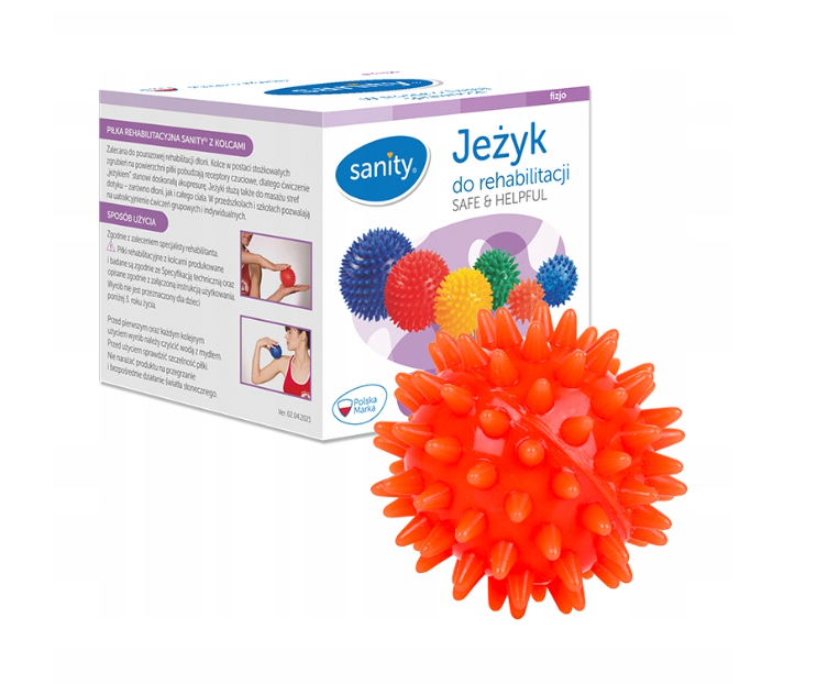 Jeżyk do rehabilitacji zalecany do pourazowej rehabilitacji dłoni. Kolce w postaci stożkowatych zgrubień na powierzchni piłki pobudzają receptory czuciowe, dlatego ćwiczenie „jeżykiem” stanowi doskonałą akupresurę. Jeżyki służą również do masażu stref dotyku. Nie zawiera ftalanów.