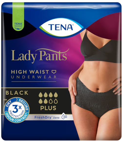 Wyrób medyczny TENA Lady Pants Plus Noir to bielizna chłonna dla kobiet. Model z wysokim stanem, w kolorze czarnym doskonale utrzymuje się na ciele zapewniając dyskretną ochronę przy nietrzymaniu moczu. Nowy ulepszony superchłonny wkład dzięki obecności kanalików – mocz jest szybciej wchłaniany do wkładu chłonnego.