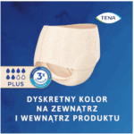 Bielizna wykonana jest z oddychającego materiału przypominającego tkaninę, nie zawiera środków zapachowych i jest delikatna dla skóry. Majtki chłonne TENA Lady Pants Plus Creme zapewniają potrójną ochronę przed przeciekaniem, nieprzyjemnym zapachem oraz wilgocią. Uczucie suchości i świeżości znacznie poprawia komfort noszenia.