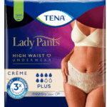 Wyrób medyczny TENA Lady Pants Plus Creme OTC Edition to bielizna chłonna dla kobiet. Model z wysokim stanem, w kolorze kremowym doskonale utrzymuje się na ciele zapewniając dyskretną ochronę przy nietrzymaniu moczu. Nowy ulepszony superchłonny wkład dzięki obecności kanalików – mocz jest szybciej wchłaniany do wkładu chłonnego.