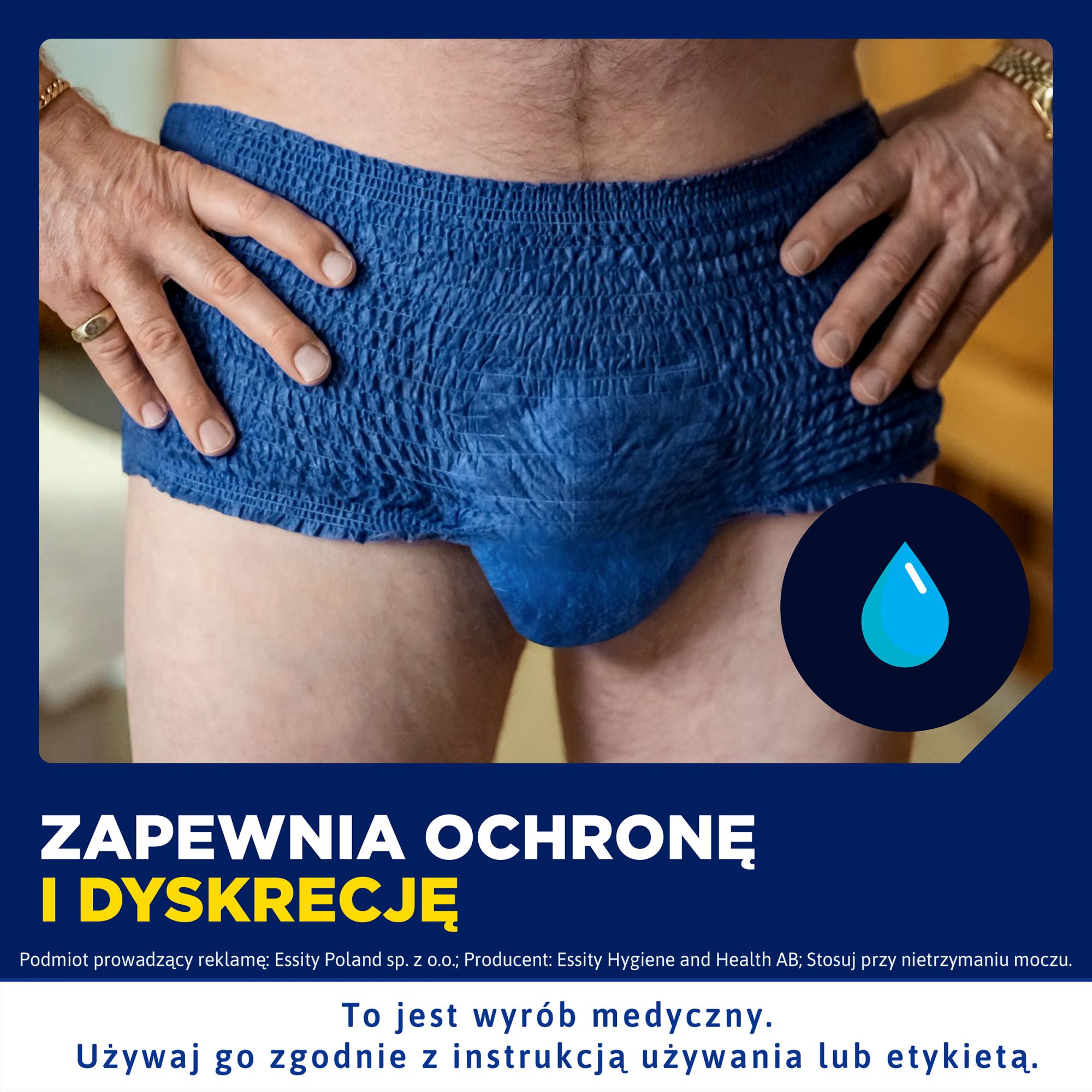TENA Men Pants Plus Blue S/M to pierwsza w Polsce bielizna chłonna stworzona specjalnie dla mężczyzn, którzy zmagają się ze średnim i ciężkim nietrzymaniem moczu. Przeznaczona dla osób chodzących i poruszających się, gwarantuje pełną swobodę ruchów i komfort w każdej sytuacji. Dzięki anatomicznemu kształtowi i niebieskiemu, dyskretnemu kolorowi doskonale dopasowuje się do męskiej sylwetki, nie odznaczając się pod ubraniem.