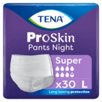 TENA PANTS PROSKIN SUPER NIGHT L (100-135 cm), majtki chłonne, 30 sztukMajtki chłonne TENA Pants to doskonałe rozwiązanie do codziennego użytku przy średnim i ciężkim nietrzymaniu moczu (poziom chłonności 7.5/8) zapewniający uczucie suchości w nocy. Dzięki technologii Lie Down Protection zapewniają większa chłonność z tyłu. Neutralizują nieprzyjemne zapachy w sposób stały i natychmiastowy. Zakładane jak zwykła bielizna, gwarantują wysoki komfort i dyskrecję, a ich dopasowanie sprawia, że nie odznaczają się pod ubraniem.