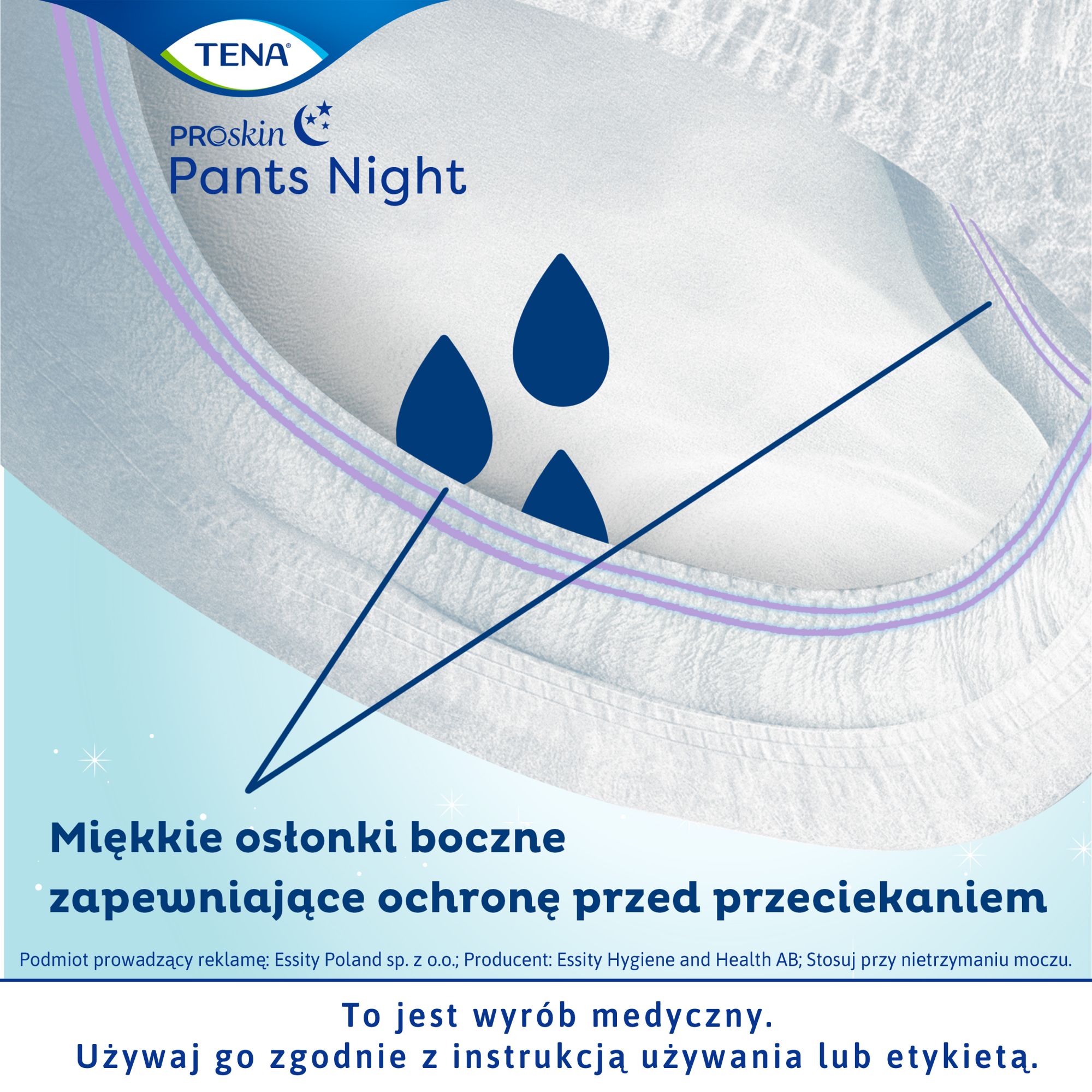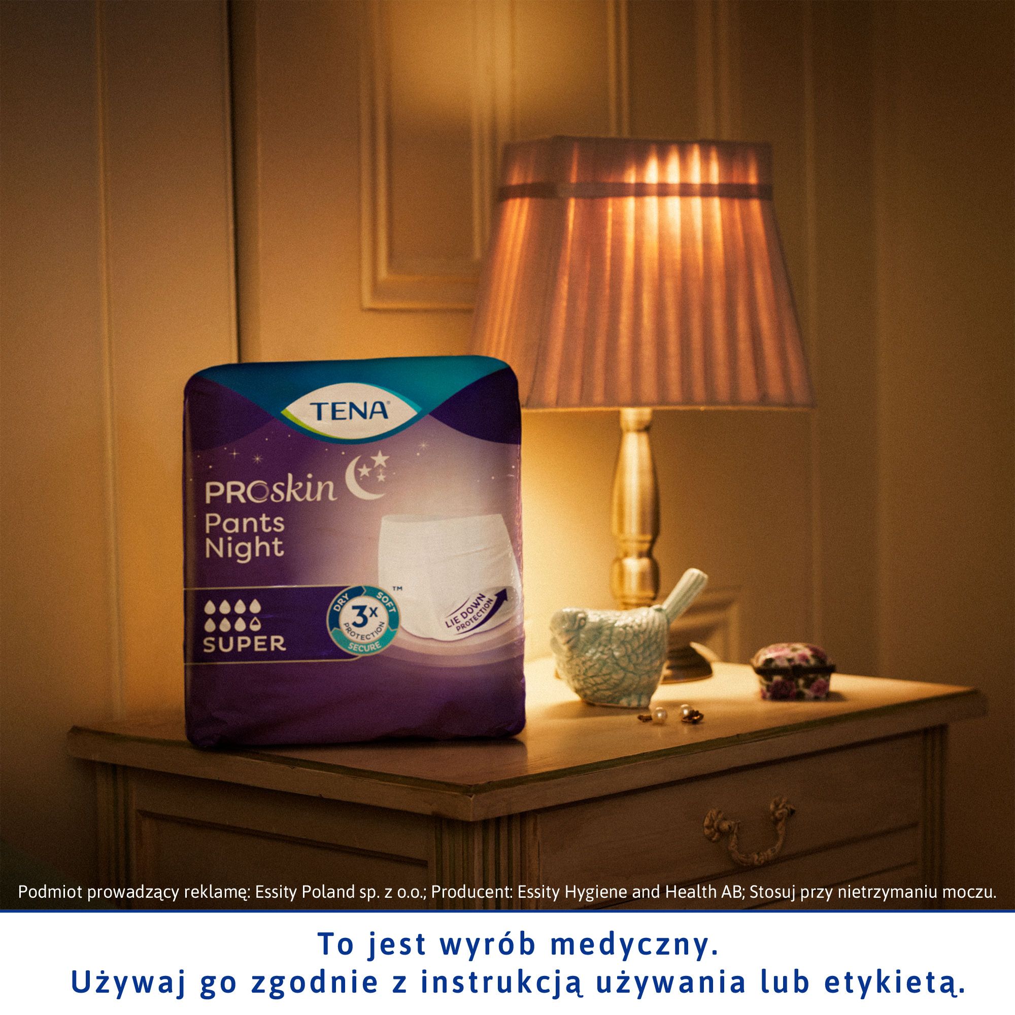 TENA Pants ProSkin Super Night to majtki chłonne stworzone specjalnie do stosowania nocnego. Zapewniają wysoką ochronę przed przeciekaniem i komfort osobom ze średnim i ciężkim nietrzymaniem moczu (chłonność 7,5/8).
