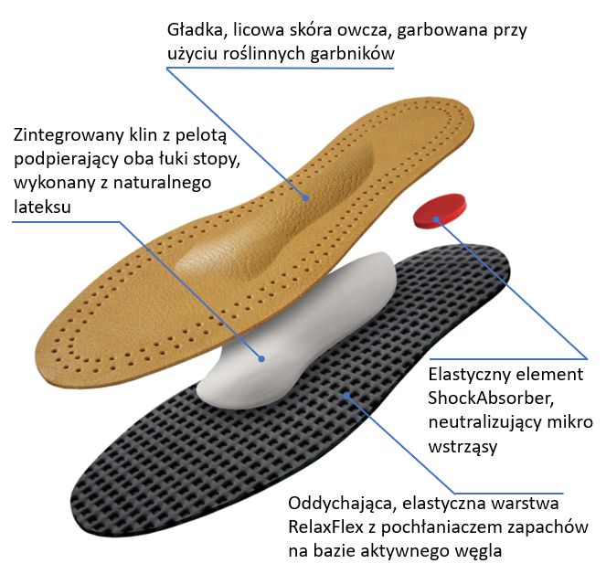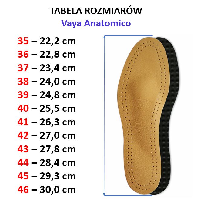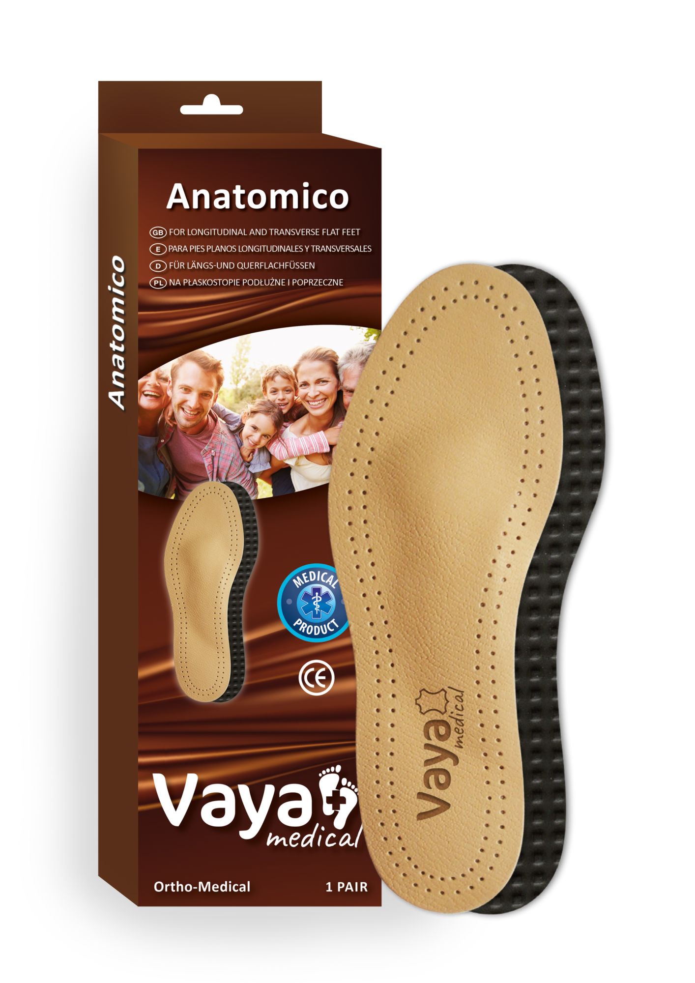 Wkładki ortopedyczne Vaya Anatomicoto skórzane wkładki wielokrotnego użycia, które zapewniają komfort stopom z płaskostopiem. Obniżenie fizjologicznych łuków stopy jakie występuje przy płaskostopiu, jest redukowane dzięki wbudowanemu, korygującemu profilowi. Element ten podpiera oba łuki a amortyzujący krążek umieszczony w okolicy pięty, redukuje mikro wstrząsy podczas chodzenia po twardym podłożu. Jeśli masz problem z płaskostopiem, to proponowane wkładki Anatomico będą dla Ciebie doskonałym rozwiązaniem. Zapobiegają opadaniu wysklepienia łuku podłużnego, odciążają i amortyzują śródstopie. Przyniosą ulgę w bólu osobom, których źródłem problemu jest obniżenie łuków stopy często związanych z niewydolnością mięśni i więzadeł. Wkładki zawierają pochłaniacz zapachów na bazie aktywnego węgla w swojej elastycznej i oddychającej warstwie. Anatomico są produktami kontynuującymi tradycje wkładek Scholl.