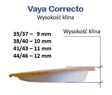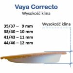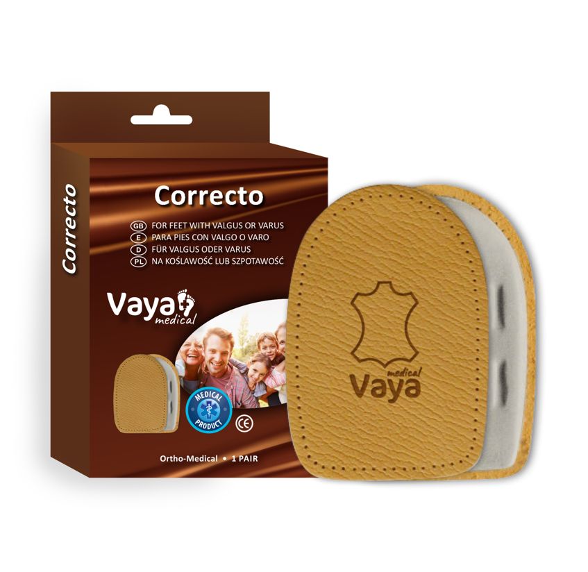 Wkładki ortopedyczne Vaya Correcto to skórzane podpiętki wielokrotnego użycia, które zapewniają komfort stopom wymagającym amortyzacji oraz właściwego ustawienia pięt. Podpiętka jest zalecana dla stóp z koślawością lub szpotawością. Podwyższona jednostronnie zapobiega wykoślawianiu obuwia i ścinaniu obcasów. W zależności od potrzeby może być stosowana jako podwyższenie wewnętrznej lub zewnętrznej krawędzi. Wkładka redukuje mikro wstrząsy podczas chodzenia po twardym podłożu. Jeśli masz problem z koślawością lub szpotawością pięt, to proponowane wkładki Correcto będą dla Ciebie doskonałym rozwiązaniem. Podpiętka zapobiega deformacji obuwia. Vaya Correcto są produktami kontynuującymi tradycje wkładek Scholl.