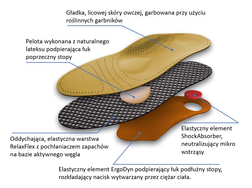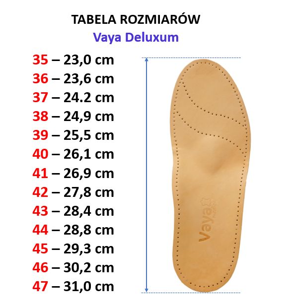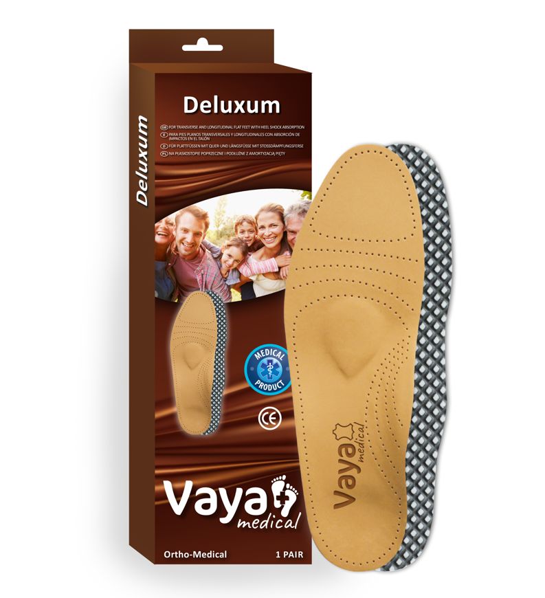Vaya Deluxum to pełne skórzane wkładki ortopedyczne wielokrotnego użycia dla stóp z zespołem przeciążenia przedstopia, dla osób aktywnych, wykonujących pracę stojącą lub wymagającą intensywnego chodzenia. Odciążając i amortyzując kości śródstopia zmniejszają dolegliwości bólowe stóp. Obniżenie fizjologicznych łuków stopy jakie występuje przy płaskostopiu, jest redukowane dzięki wbudowanemu specjalnemu profilowi i pelocie. Profil wspiera łuk podłużny lekko supinując stopę, zapewnia komfort i elastyczność podczas chodzenia. Pelota podpierająca łuk śródstopia skutecznie zapobiega zmęczeniu stóp. Amortyzujący krążek umieszczony w okolicy pięty, redukuje mikro wstrząsy podczas chodzenia po twardym podłożu. Jeśli masz problem z płaskostopiem to proponowane wkładki Deluxum będą dla Ciebie doskonałym rozwiązaniem. Zapobiegają opadaniu wysklepienia łuku podłużnego, odciążają i amortyzują śródstopie. Oddychająca warstwa na bazie aktywnego węgla zapobiega nieprzyjemnym zapachom.