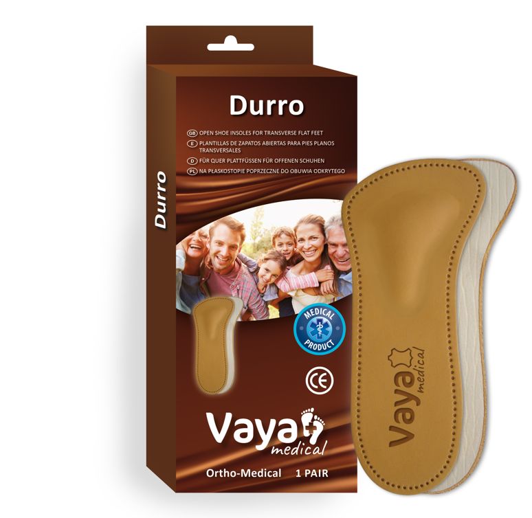 Wkładki ortopedyczne Durro to skórzane wkładki wielokrotnego użycia, przeznaczone dla stóp z płaskostopiem poprzecznym do wąskiego obuwia. Obniżony fizjologiczny łuk poprzeczny, który występuje przy płaskostopiu, jest redukowany przez pelotę. Wkładka wspiera łuk śródstopia, zmienia rozłożenie sił nacisku przedstopia, zmniejsza dolegliwości bólowe i ryzyko wystąpienia odcisków i modzeli. Dzięki wbudowanemu elementowi amortyzującemu piętę, wkładka redukuje mikro wstrząsy podczas chodzenia po twardym podłożu. Jeśli masz problem z płaskostopiem poprzecznym, to proponowane wkładki Durro będą dla Ciebie doskonałym rozwiązaniem. Zapobiegają zmęczeniu stóp, odciążają i amortyzują śródstopie.