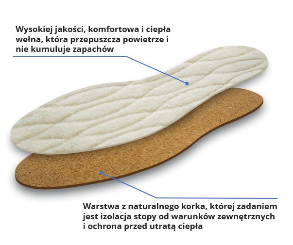 Wkładki do butów Vaya Inverno mają właściwości termoizolacyjne. Vaya Inverno są bardzo ciepłe i higieniczne, mają 3 mm grubości, są komfortowe oraz doskonale izolują od zimna. Dzięki swojej budowie z tkaniny wełnianej i naturalnego korka zapewniają doskonałą izolację termiczną, uczucie ciepła oraz właściwą cyrkulację powietrza. Wierzchnia warstwa z wełnianej tkaniny zapewnia przyjemne ciepło dla stopy. Miękka wełna nie kumuluje zapachów, przepuszcza powietrze dając uczucie suchej stopy. Spodnia warstwa z naturalnego korka amortyzuje wstrząsy, izoluje od zimna oraz zapobiega przesuwaniu się wkładki w bucie. Vaya Inverno są idealne dla marznących stóp, sprawdzają się w obuwiu zimowym lub sportowym. Obszycie lamówką zapewnia dobre ułożenie wkładek w butach.