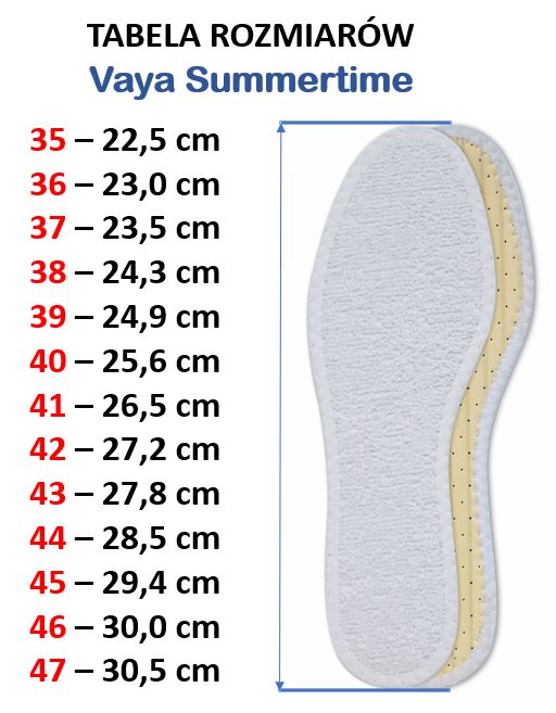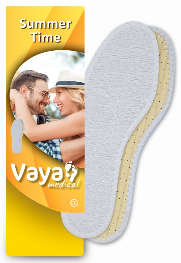 Letnie wkładki do butów Vaya Summer Time to wysokiej jakości wkładki do stosowania przy bosych stopach. Dzięki swojej zaawansowanej technologicznie budowie posiadają 3 warstwy. Każda warstwa pełni unikalną funkcję zapewniając świeżość, komfort i higienę stosowania wkładki. Vaya Summer Time są idealne dla bosych stóp, sprawdzają się w obuwiu sportowym, trampkach czy tenisówkach.
